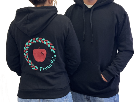 Black hoodie produced, sewn and screen-printed in Portugal, with the Fruta Feia logo on the back. Available in sizes S, M, L and XL and in a tighter/shorter model and wider/longer model.